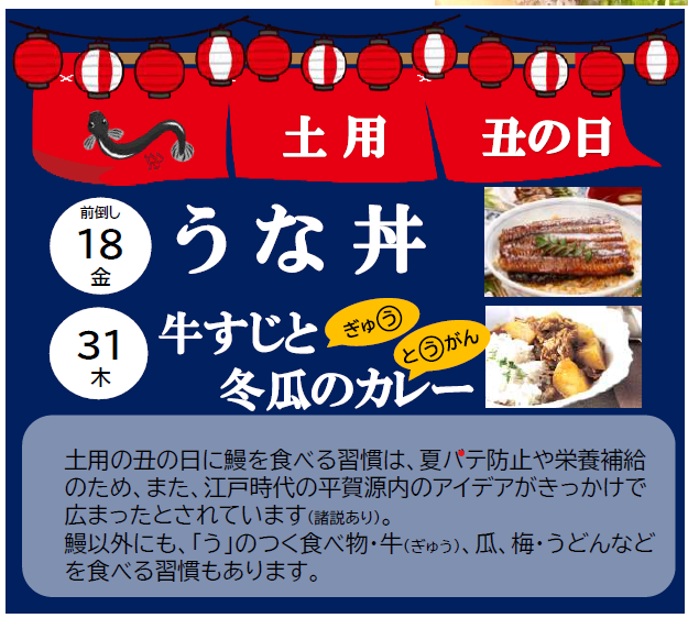 今年の夏土用は7月19日と31日。フジ産業では今年も一部事業所にて限定ランチをご用意いたします。一の丑は土曜のため1日前倒しの18日に定番の「うな丼」を、二の丑は「う」のつくスタミナメニューとして31日に「牛すじと冬瓜のカレー」をラインナップ。厳しい暑さが続きますが、季節のお料理に癒されて、心も身体も元気に過ごしたいものですね。