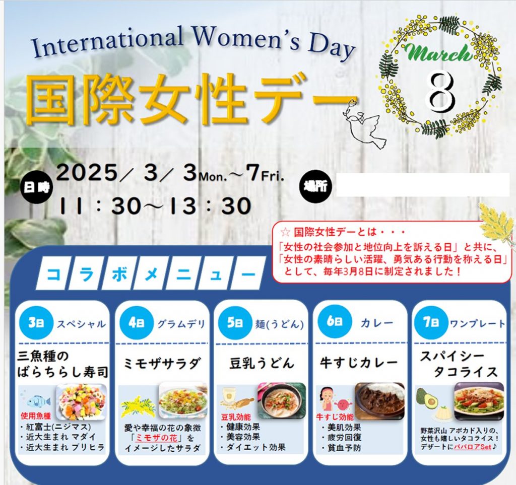 フジ産業では、この3月8日の「国際女性デー」に合わせ、2025年3月3日(月)~7日(金)の間、一部事業所のランチで特別メニューをご提供いたします。