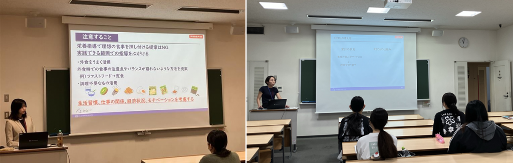 2025年10月13日~11月24日の間、当社の管理栄養士3名が、戸板女子短期大学 食物栄養科の「スポーツ栄養演習」の講義を、毎週月曜、計6回にわたり、非常勤講師として担当しています。