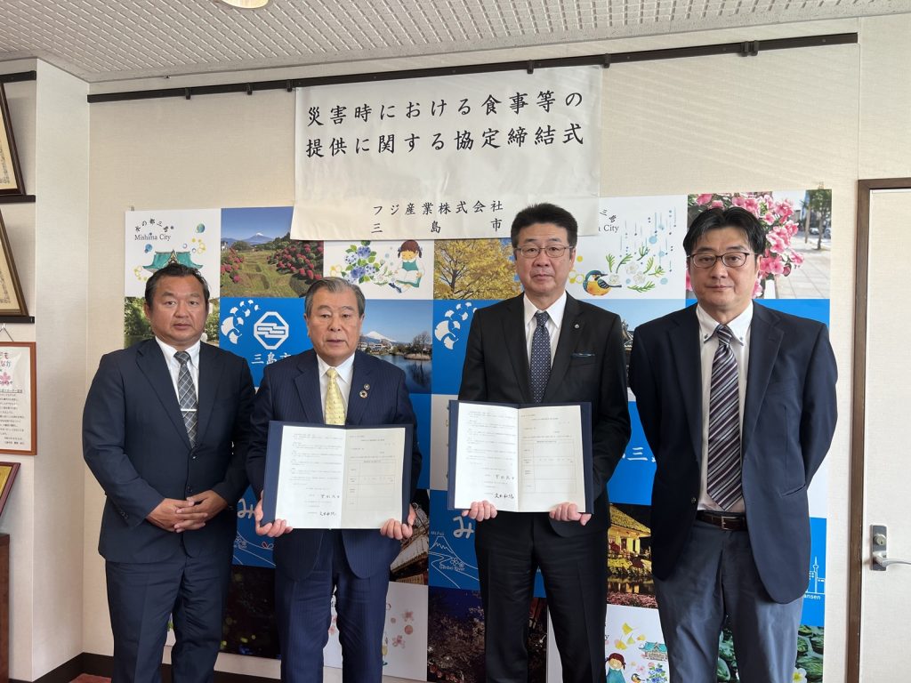 2025年3月24日、フジ産業株式会社(東京都港区、代表取締役社長 久田和紀)は、静岡県三島市(以下三島市)と「災害時における食事等の提供に関する協定」を締結いたしました。